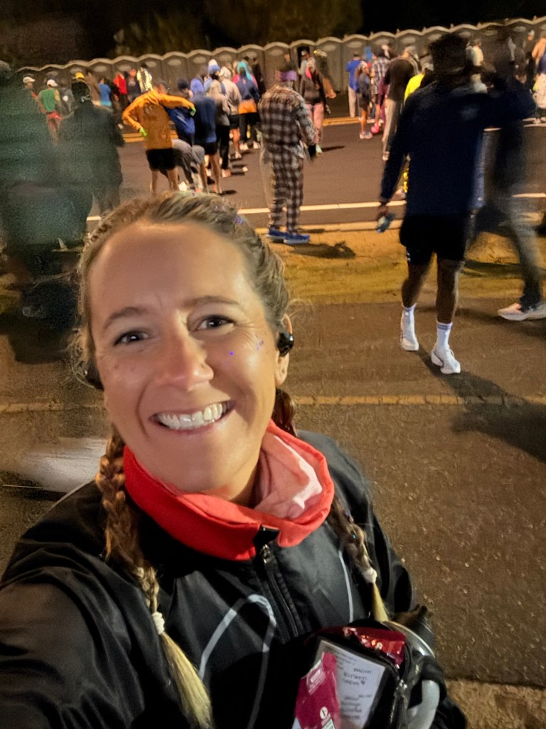 My stomach hurt, but I blamed nerves… and the lovely timing of being a woman. Honestly, I’m usually stronger during those days anyway, so whatever. Stew dropped me off at the bus pickup earlier than last year. I hopped right on like a seasoned veteran. Warmed up. Walked around. Drank some water. Still had stomach cramps, but again — nerves.